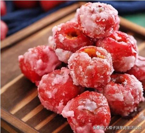 6:倒出来,让山楂完全冷却就会出现白色的冰晶状糖衣啦。