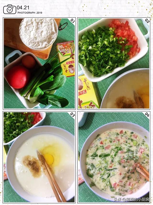 1、面粉100克、西红柿半个(可用胡萝卜)小葱两颗、鸡蛋1个、小油菜1颗、盐少许、十三香少许!