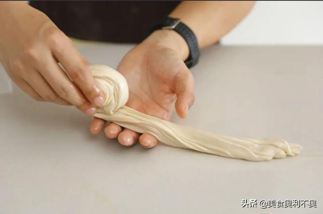 5、将长条卷起来,盘旋成一个圆形,面团静置10分钟后按扁;