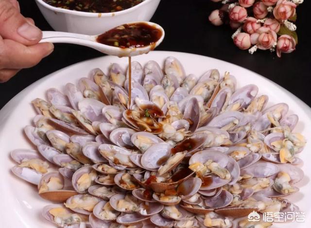 花蛤摆盘成功后 ,倒入调味汁,就可以了,注意每个花蛤都能雨露匀沾,这样吃起来就毫无压力,美味可口,赶紧的,咱们动手吧。
