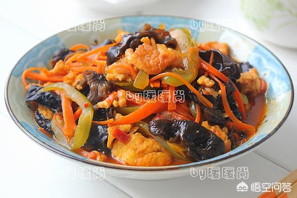 6. 下青椒、胡萝卜和木耳翻炒至木耳断生。