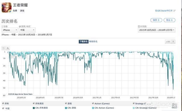 首先那我们来看苹果商店的关于王者荣耀的排名报表,可以明显看见王者荣耀虽然经常有大幅波动但是经常会在前十出现,从15年到18年一直很火爆,对于一款游戏来说,这样漫长的周期仍然经久不衰还是有它独特的魅力所在的。