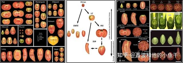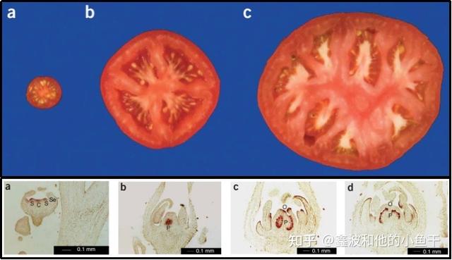 番茄驯化过程中果实大小增加。野生种 S. pimpinellifolium (a),中等大小加工品种 E6203 (b) 和大型品种 Jumbo Red(c)。 果实从 a 增加到 b 主要是通过增加细胞分裂,而从 b 到 c 是通过增加室数来实现的。 免疫染色显示了影响果实大小的 YABBY 转录因子 fas 在花发育不同阶段的表达模式。