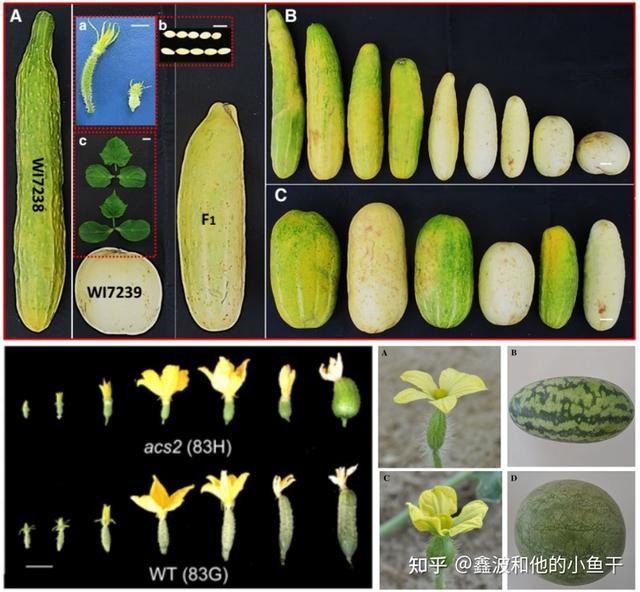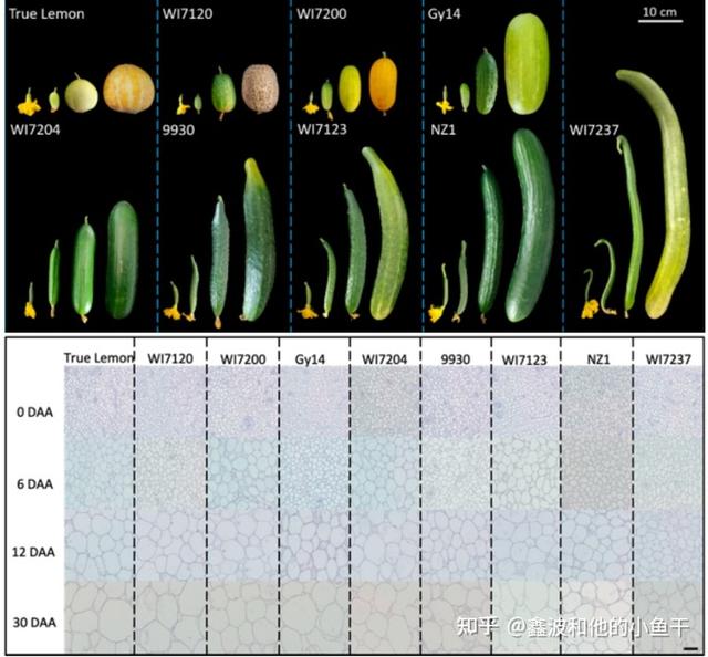 9 个黄瓜自交系的子房和果实照片,及不同的子房和果实对应的细胞图片。细胞数量的变化,影响果实的形状及大小。