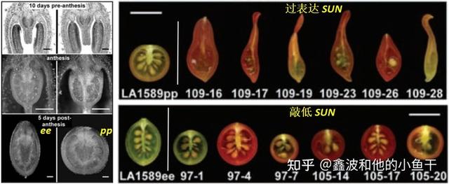 番茄的 SUN 基因编码一个 IQD 家族钙调蛋白,诱导果实伸长。过表达 SUN 可以让圆果实的番茄(pp)长长,敲低 SUN 可以让长果实的番茄(ee)变圆。