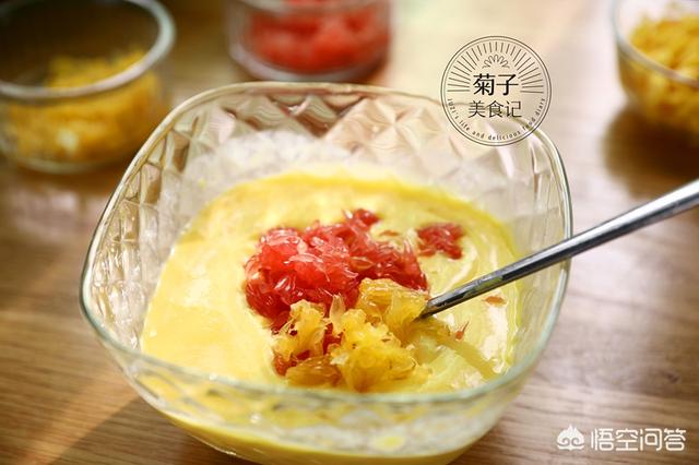 第三步:放入西米再次拌匀,最后点缀上芒果丁,西柚和夏橙肉,简单美味的杨枝甘露就做好了,杨枝甘露的色香虽来自芒果,精髓韵味却在柚肉,其软脆参半、甜中带酸的独特口感,需靠柚粒来铺陈延展,并以西米的对比来烘衬加深,始以甜香软媚,终以清酸爽脆,清奇殊异耐人寻味,一起来制作品尝美味吧