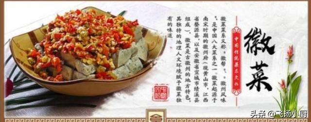8.徽菜。由皖南、沿江和沿淮地方风味构成。皖南菜是主要代表。