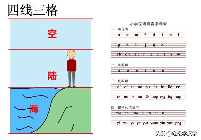 中间一格是我们生活的地方,叫陆地,头顶是天空,脚底还要往下的地方就是河流、海洋了,我们用四条线把它们分隔开,可以分成海、陆、空三个格。字母就分布在这样的三层里面,一般来说,像鱼这样的才能生活在海洋,像鸟这样会飞的才能生活在天空对不对?至于不会游泳,也没有翅膀的,就乖乖的呆在陆地好了。