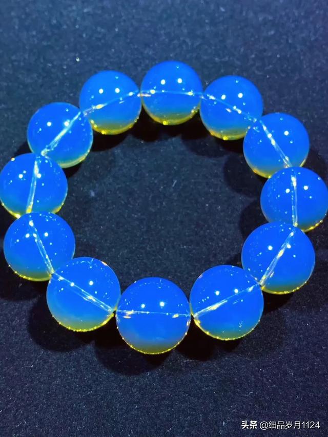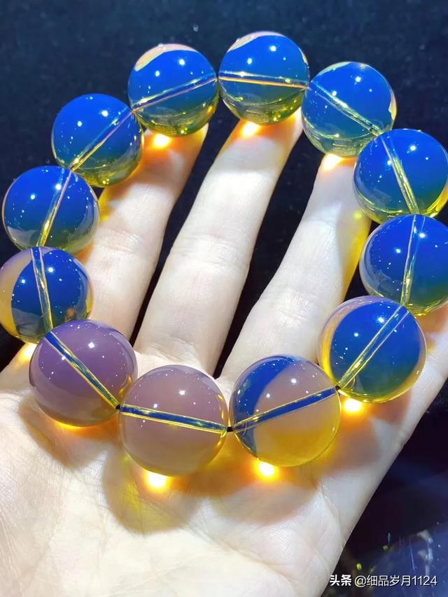 而蓝珀,就是蓝色的琥珀。但所谓的蓝色,不是指琥珀的固有色,而是指潜在色和变色。蓝珀的透光色以金黄色为主,或偏于黄、或偏于绿,可以从淡黄到金黄到黄绿;而蓝珀的荧光和变色以蓝色为主,或偏于蓝、或偏于绿,可以从纯蓝到高蓝到蓝绿。