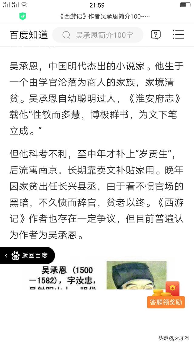 其时,吴承恩写西游记的目的之一,就是号召广大劳苦大众(整个猴子家族),团结起来,推翻吃人的朝庭(天庭)。我们从作者身世就能看出来,但他不敢直写朝庭,以天庭代之,望朋友们阅读时注意。因此,又有人说:“真正的《西游记》大闹天宫便结束了。”有不同意见,可在下方留言互动。以下图片由浏览器提供:
