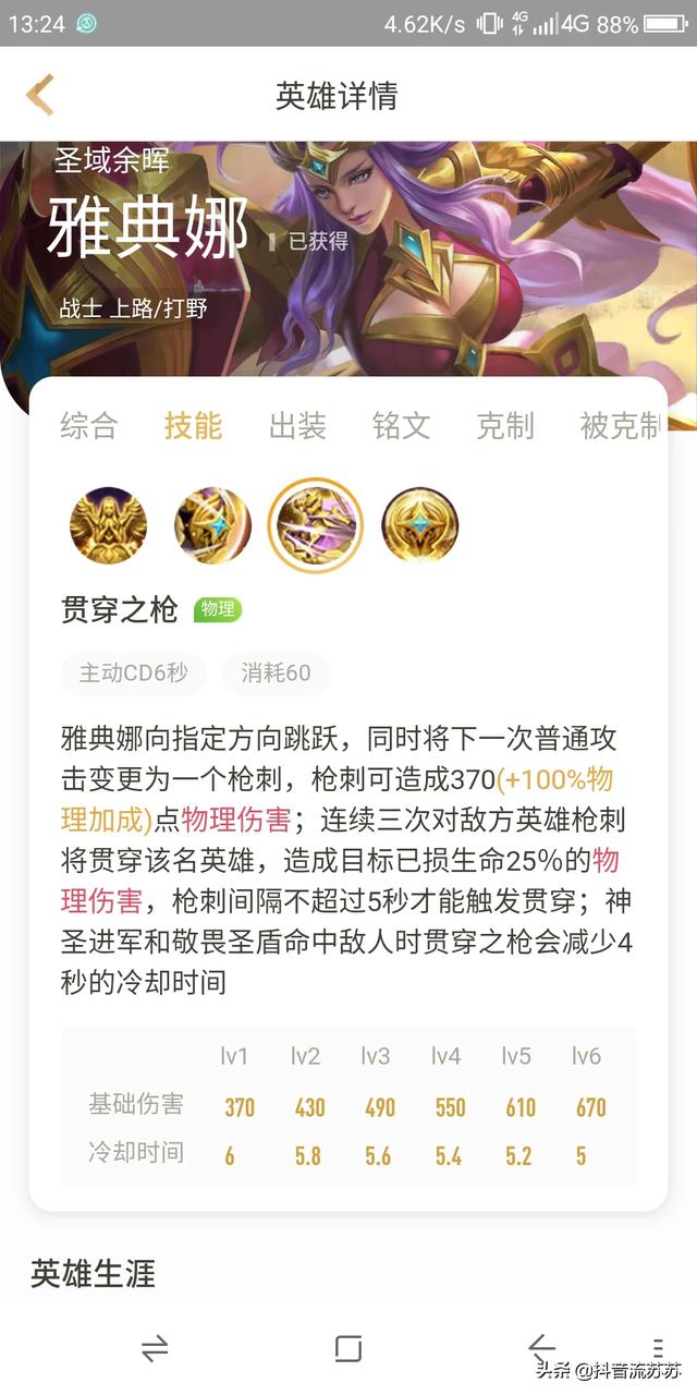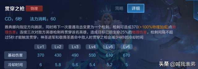 第一个是雅典娜,雅典娜的一技能贯穿之枪,在5秒内连续3次用枪刺命中敌方,就可以造成对目标已损25%生命的25%的物理伤害!
