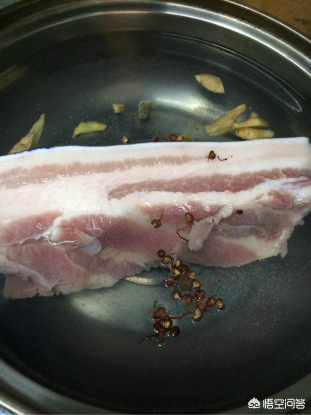 3:五花肉的煮制,把五花肉冷水下锅,大火烧开 ,打去表面浮沫 ,放葱姜料酒和少许青花椒去腥,煮至八成熟捞出备用;